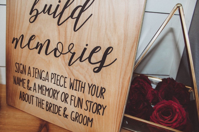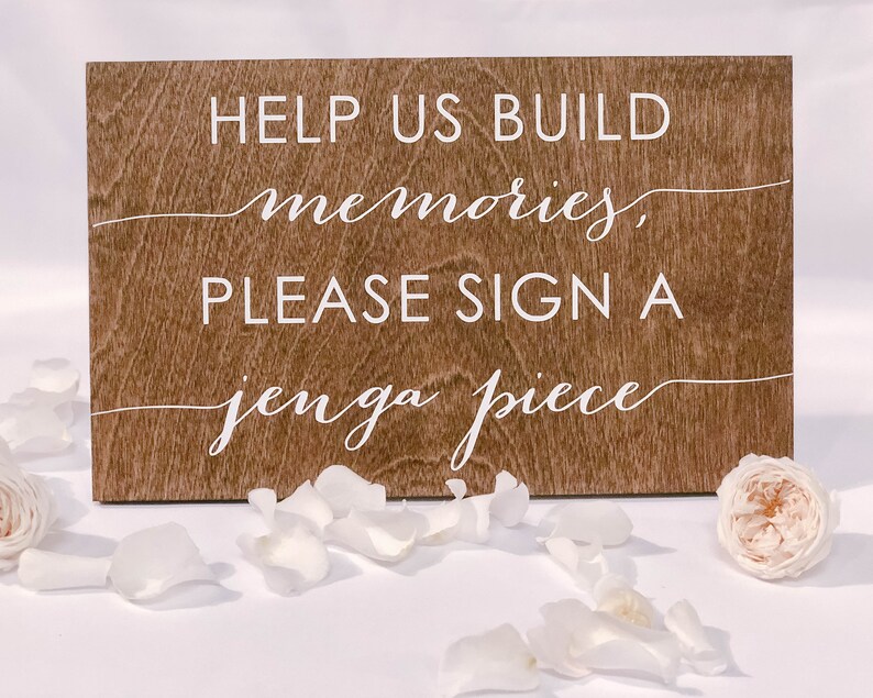 8x10 unframed build memories please sign a jenga piece/burlap print sign/guestbook sign rustic shabby chic vintage wedding decor sign 5.0 out of 5 stars 3 $19.00 $ 19. Wooden sign jenga wedding guest book jenga wedding sign wedding guestbook jenga wedding game alternative guestbook jenga guestbook wedding decor wood plaque wall art funny wood sign wall hanger home d. ++++ listing include ++++ wooden blocks laser engraved with 2 names & a. Etsy uses cookies and similar technologies to give you a better experience, enabling things like: Wedding guest books & pens └ wedding supplies └ home & garden all categories food & drinks antiques art baby books, magazines business cameras cars, bikes, boats clothing, shoes & accessories coins collectables computers/tablets.